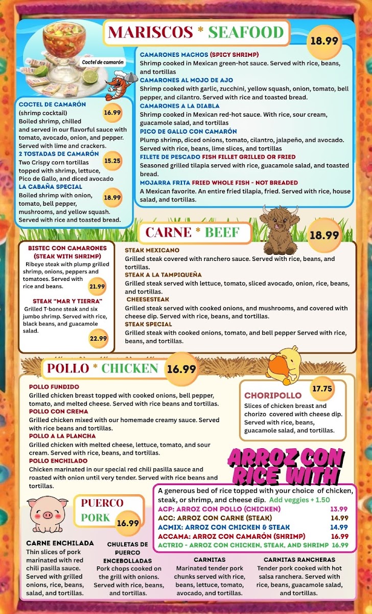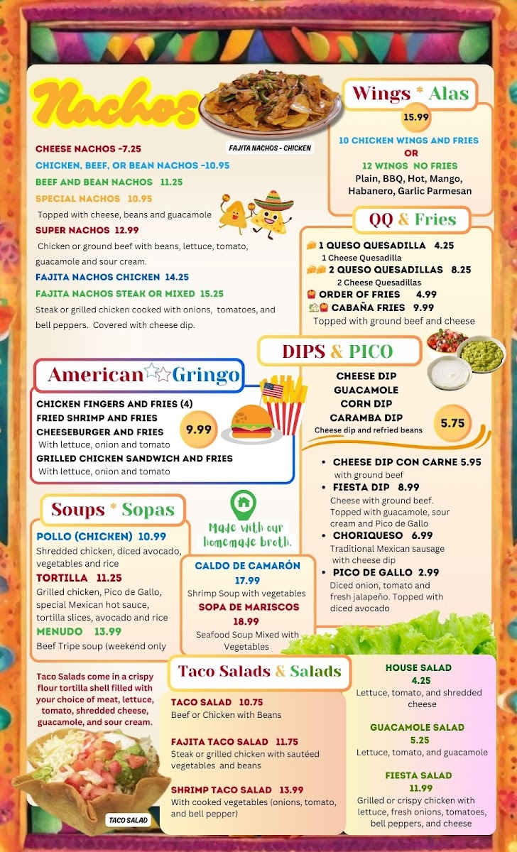 The menu at La Cabana Mexican Restaurant offers a variety of familiar and comforting Mexican dishes served in generous portions, perfect for casual meals with family or friends. Whether you're stopping in for a relaxed lunch or a hearty dinner, the selection includes everything from sizzling fajitas to fresh shrimp cocktails, accompanied by an array of salsas that range from mild to spicy.